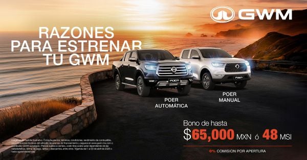 Descubre las razones para estrenar una GWM Poer en sus versiones Manual o Automática. Aprovecha un bono de hasta $65,000 MXN, financiamiento a 48 meses sin intereses y 0% comisión por apertura. Potencia, capacidad de carga y el rendimiento que necesitas para el trabajo y la aventura.