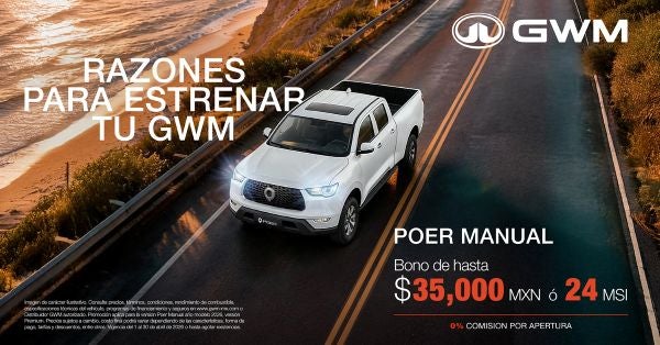 Toma el control con la GWM Poer Manual, la pickup que combina la precisión de la transmisión manual con una capacidad de carga de más de una tonelada. Aprovecha un bono de hasta $35,000 MXN, financiamiento a 24 meses sin intereses y 0% comisión por apertura. Potencia, versatilidad y el respaldo de GWM para el trabajo y la aventura.