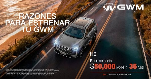 Este es el momento ideal para estrenar el Haval H6, el SUV que combina diseño, tecnología y rendimiento excepcional. Aprovecha un bono de hasta $50,000 MXN, financiamiento a 36 meses sin intereses y 0% comisión por apertura. Confianza, estilo y las mejores condiciones para que te subas a un GWM.