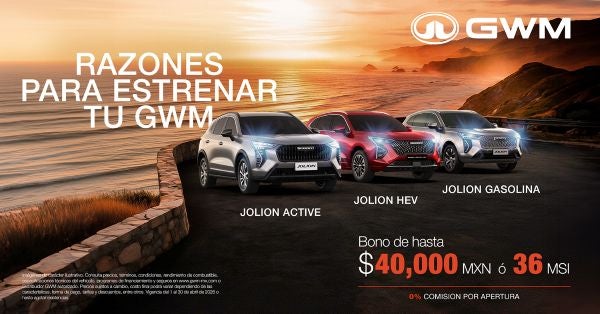 Encuentra todas las razones para estrenar un Haval Jolion en sus versiones HEV, Gasolina o Active. Aprovecha un bono de hasta $40,000 MXN, financiamiento a 36 meses sin intereses y 0% comisión por apertura. Diseño moderno, eficiencia y tecnología para disfrutar cada trayecto.