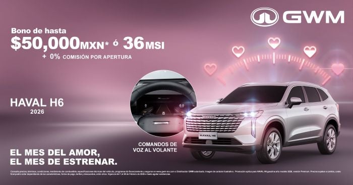 Estrena en el mes del amor el Haval H6 2026, equipado con comandos de voz al volante para una conducción más intuitiva y segura. Elige entre un bono de hasta $50,000 MXN* o 36 meses sin intereses, además de 0% comisión por apertura. Tecnología avanzada, diseño innovador y confort premium en un SUV que se adapta a tu estilo de vida. ¡Conduce con inteligencia y beneficios que enamoran!