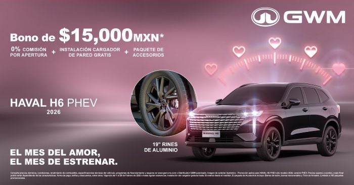Vive el mes del amor con la potencia híbrida enchufable del Haval H6 PHEV 2026, equipado con rines de aluminio de 19" y un paquete de accesorios incluido. Aprovecha un bono de $15,000 MXN*, la instalación gratuita de un cargador de pared y 0% comisión por apertura. Tecnología, confort y eficiencia en un SUV listo para conquistar cualquier camino. ¡Estrena con todo incluido!