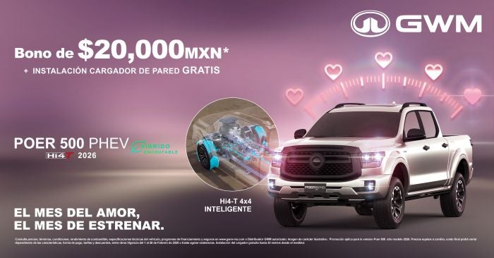 Este mes del amor, estrena la Poer 500 PHEV Hi4 2026, la pickup híbrida enchufable que combina potencia de 400 CV con un sistema Hi4-T 4x4 inteligente para cualquier terreno. Aprovecha un bono de $20,000 MXN* y la instalación gratuita de un cargador de pared. Eficiencia, fuerza y tecnología avanzada en un vehículo listo para el trabajo y la aventura. ¡El futuro de la conducción híbrida ya está aquí!