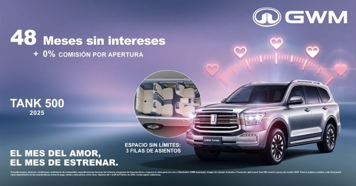 Celebra el mes del amor viajando con toda tu familia y más. El Tank 500 2025 ofrece espacio sin límites con 3 filas de asientos y condiciones exclusivas: 48 meses sin intereses y 0% comisión por apertura. Potencia, confort premium y tecnología avanzada en una SUV diseñada para los trayectos más exigentes. ¡Estrena el lujo que enamora!