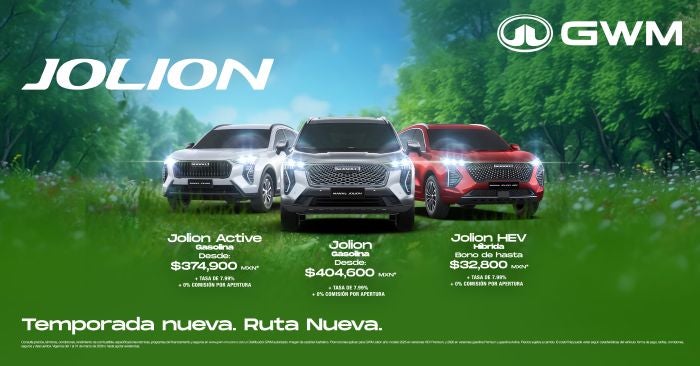 Renueva tu camino con el Haval Jolion, el SUV compacto que combina diseño, tecnología y eficiencia. Para la versión Jolion Active gasolina, disfruta un precio desde $374,900 MXN; para la versión Jolion HEV, obtén un bono de hasta $32,800 MXN. Ambas versiones incluyen tasa desde 7.99% y 0% comisión por apertura. Estilo, rendimiento y el respaldo de GWM. ¡Elige tu ruta y estrena hoy!
