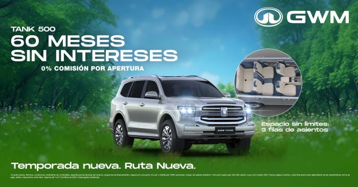 Viaja con toda tu familia y más en el Tank 500, la SUV de lujo que ofrece espacio sin límites gracias a sus 3 filas de asientos. Aprovecha un increíble financiamiento a 60 meses sin intereses y 0% comisión por apertura. Potencia, confort premium y tecnología avanzada para los trayectos más exigentes. ¡Elige tu ruta y estrena hoy!