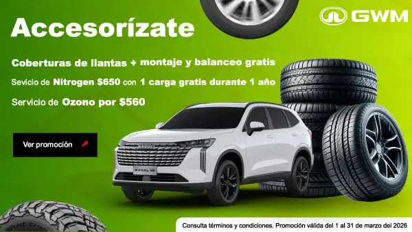 Cuida al máximo tu vehículo con los servicios especiales de GWM. Aprovecha nuestra promoción: • Cobertura de llantas con montaje y balanceo gratis • Servicio de nitrógeno por solo $650, que incluye 1 carga gratis durante 1 año • Servicio de ozono por $560 para desinfección profunda de tu cabina