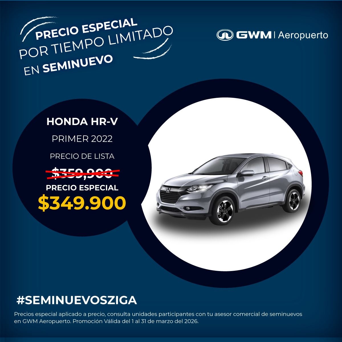 El precio mostrado ya incluye el bono aplicado. Válido únicamente para Honda HR-V Primer modelo 2022 seminuevo.