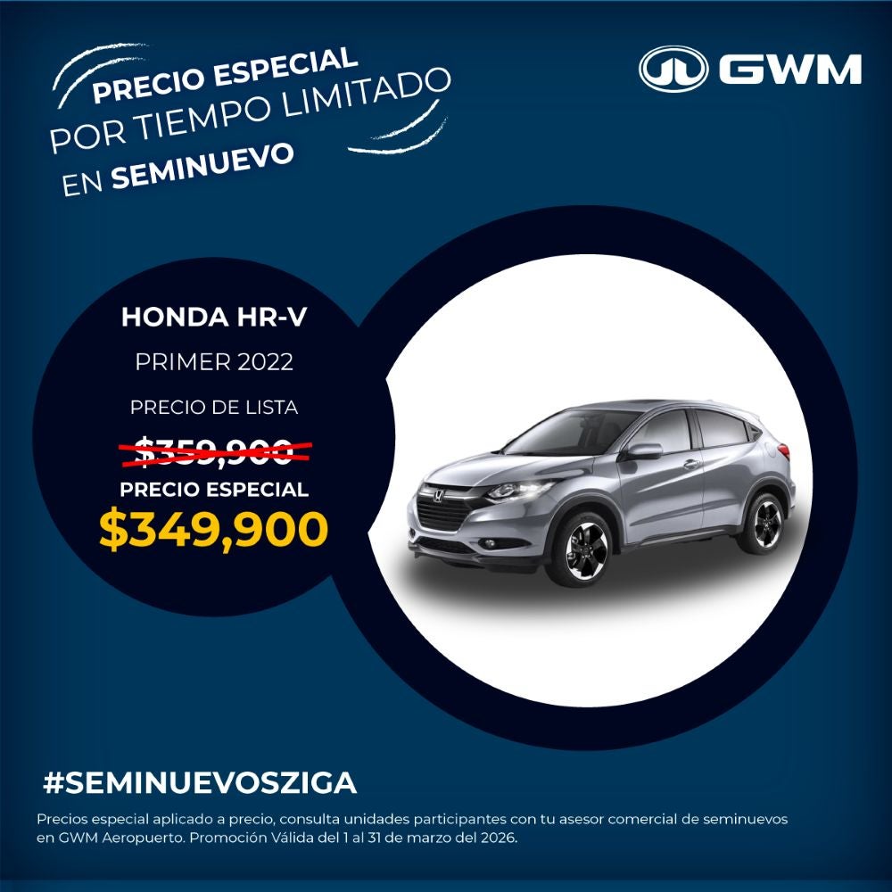 El precio mostrado ya incluye el bono aplicado. Válido únicamente para Honda HR-V Primer modelo 2022 seminuevo.