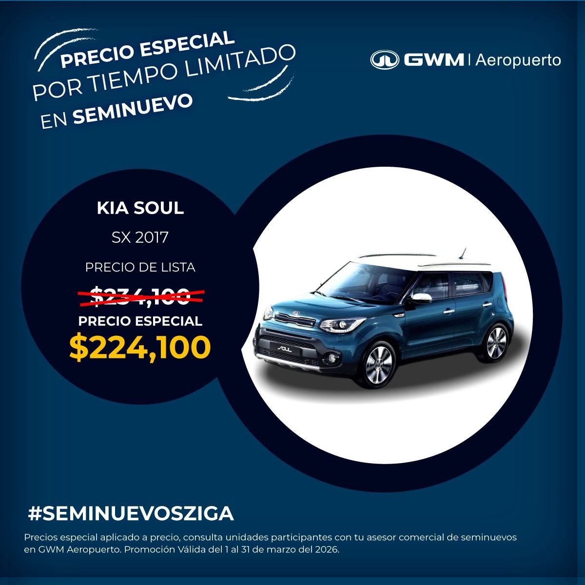 El precio mostrado ya incluye el bono aplicado. Válido únicamente para Kia Soul SX modelo 2017 seminuevo.