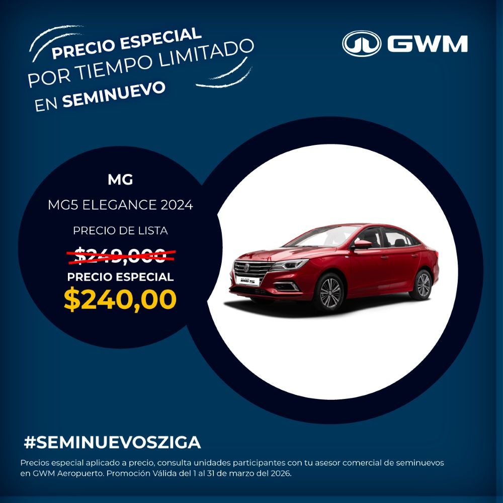 El precio mostrado ya incluye el bono aplicado. Válido únicamente para MG5 Elegance modelo 2024 seminuevo.