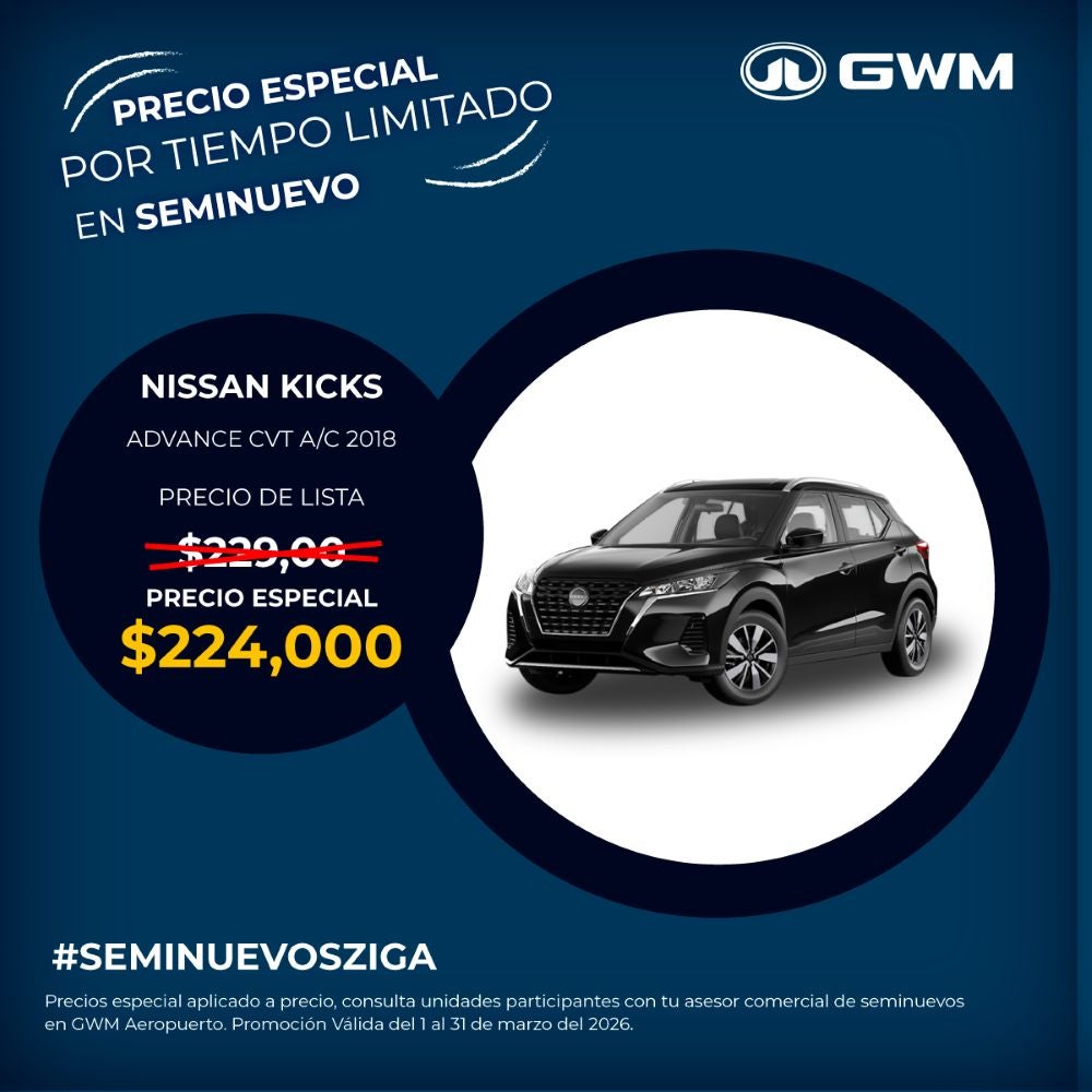 El precio mostrado ya incluye el bono aplicado. Válido únicamente para Nissan Kicks Advance CVT A/C modelo 2018 seminuevo