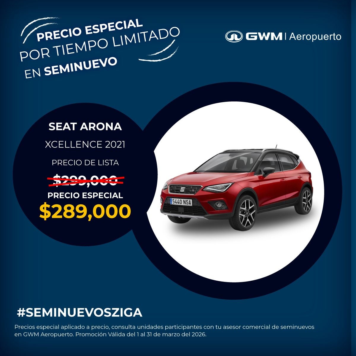 El precio mostrado ya incluye el bono aplicado. Válido únicamente para SEAT Arona Xcellence modelo 2021 seminuevo.
